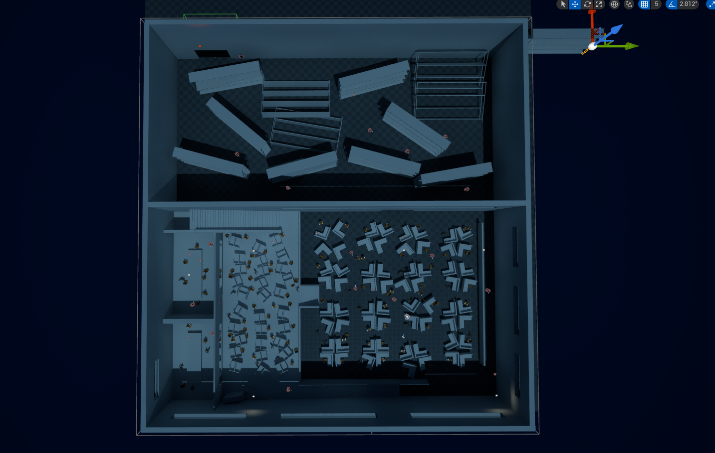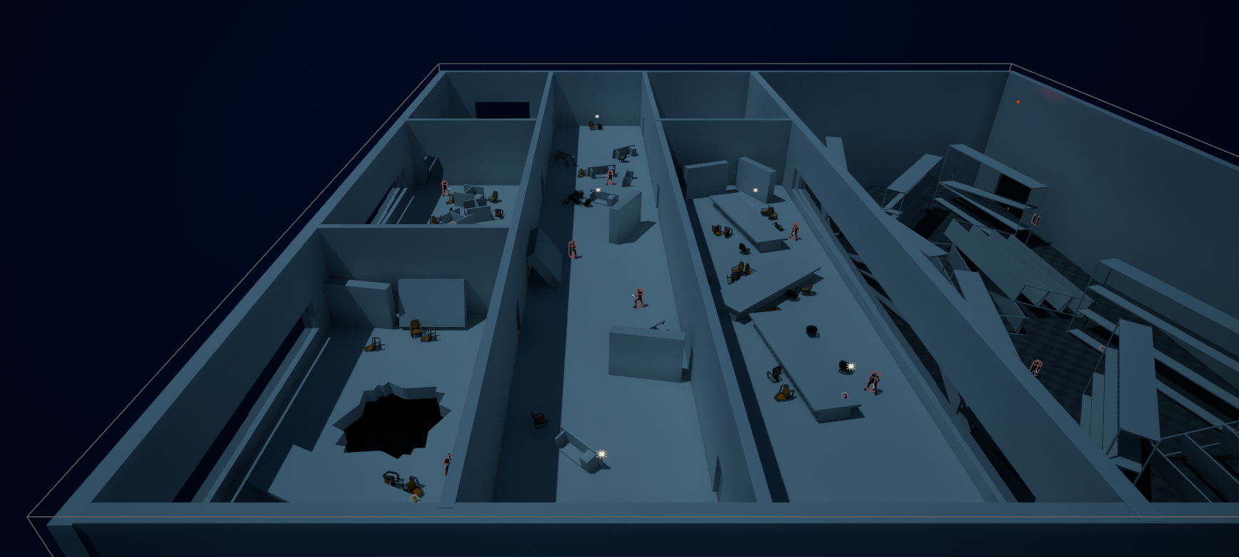 I decided to go with an office and warehouse for the level because I wanted to create multiple tight, claustrophobic spaces that you typically see in other survival horror games such as the Resident Evil franchise. An environment like this allowed me to heavily experiment with the level design, and find the right balance both for difficulty and exploration. I scarcely played ammo and health pickups around the level, because I never wanted the player to feel too safe, or feel like they can easily kill every zombie.